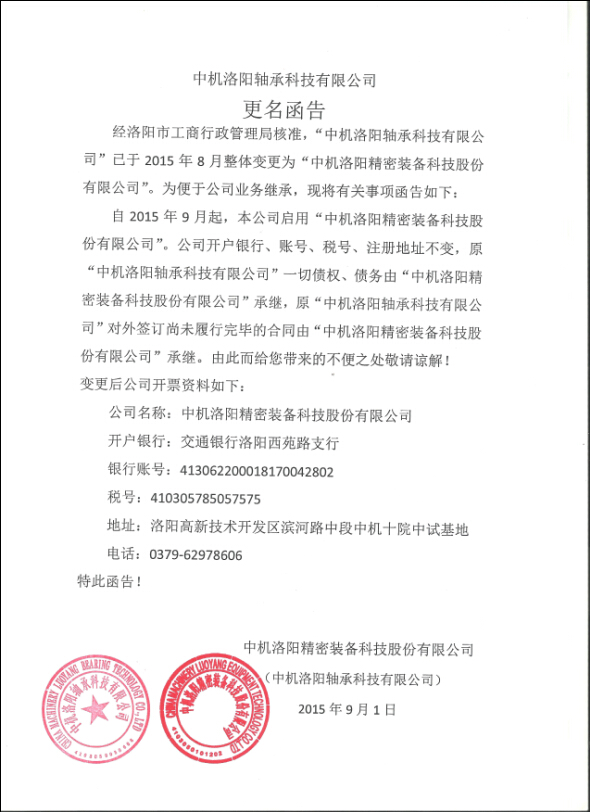 中機(jī)洛陽軸承科技有限公司更名函告